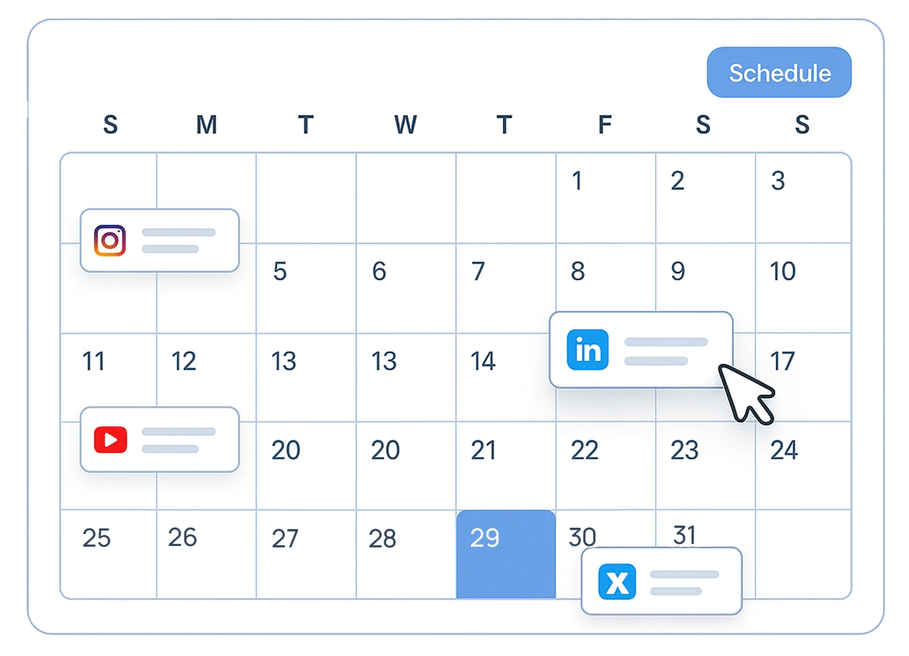 A social media calendar is a visual planning tool that helps you organize and schedule your social media posts in advance. It shows all your planned content across different platforms in one place, making it easier to plan posting on social media consistently and strategically.